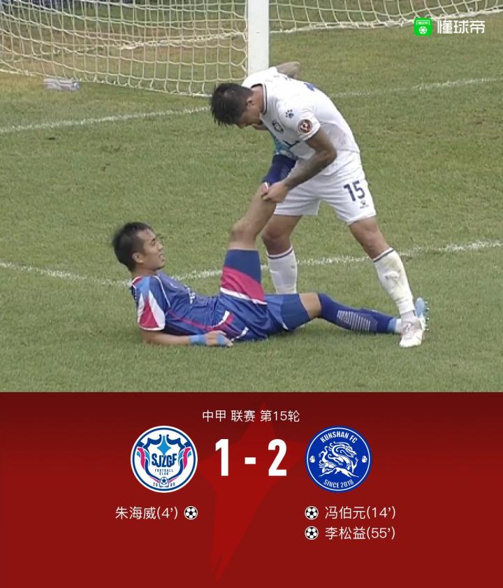 第14分钟,昆山徐骏敏禁区左侧下底传中,高中锋冯伯元头球破门扳平比分。昆山1-1石家庄。