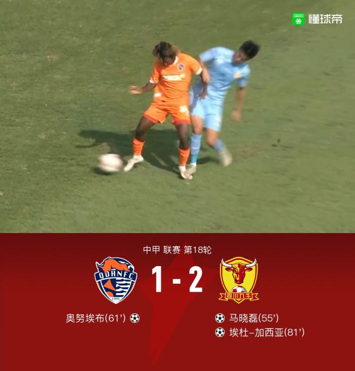 第55分钟,打破僵局!马晓磊抢射得手,四川九牛1-0青岛海牛。