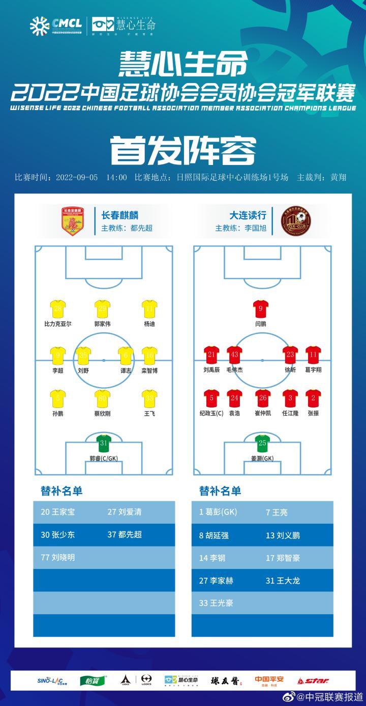 此役,长春麒麟替补席只有5名球员,其中还包括身披37号球衣的主教练都先超。首发阵容中,门将郭睿担任场上队长,郭家伟、杨迪、刘野等球员首发登场。