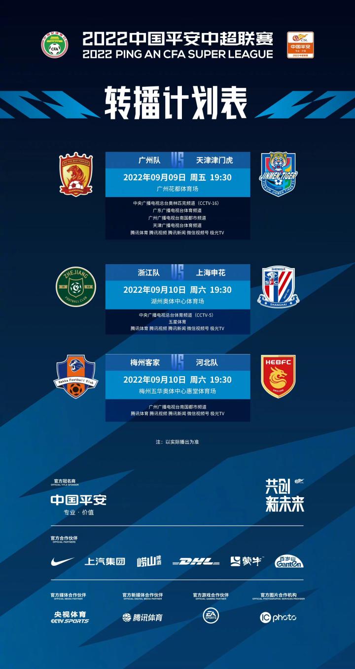 9月9日、10日,2022赛季中超联赛第17轮将进行3场比赛(其他场次延期)。9月8日,中超官方发布了这3场比赛的转播计划。