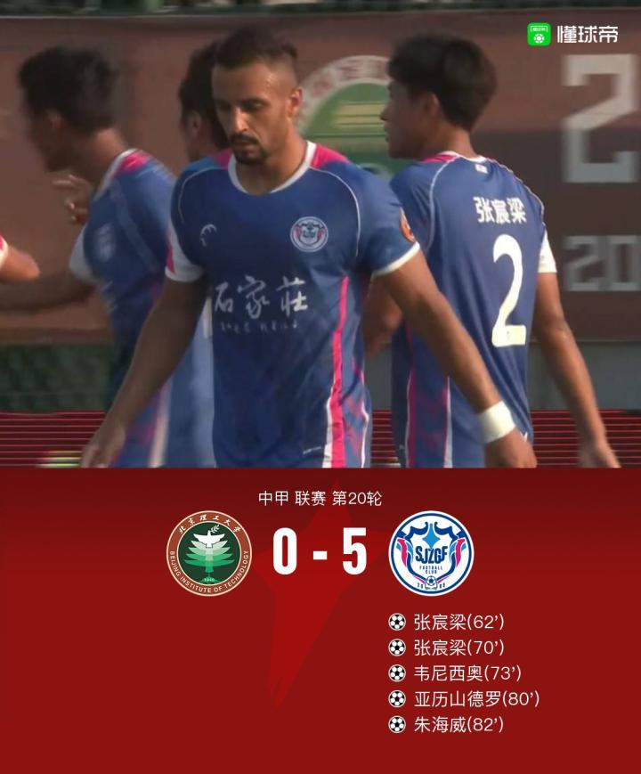 北京时间9月11日15:30,中甲第20轮展开较量,北理工对阵石家庄功夫。上半场欧阳帮外围劲射,皮球被傅京宇扑出,下半场朱海威助攻张宸梁抢点头球破门,随后汪嵩角球助攻张宸梁头球破门梅开二度,之后张宸梁助攻韦尼西奥后点包抄破门,之后的比赛赵舒豪角球助攻亚历山德罗头球破门,朱海威世界波建功。全场结束,北理工0-5石家庄。