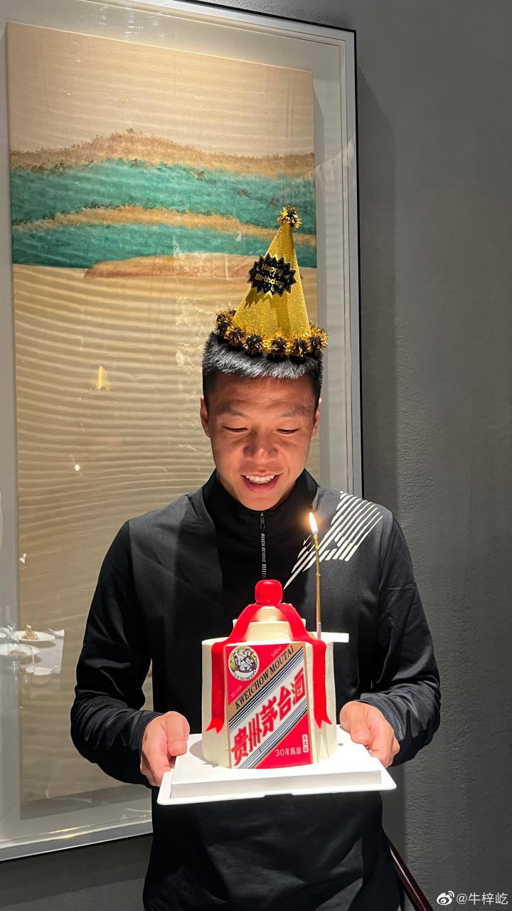 懂球帝首页>动态> 河南队后卫牛梓屹晒庆生照,生日蛋糕造型是茅台酒