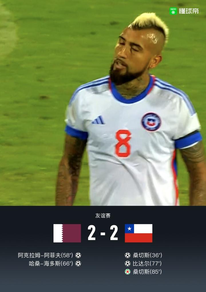 北京时间9月28日1点,一场国际足球友谊赛在奥地利维也纳进行,由卡塔尔对阵智利。上半场桑切斯的远射被巴沙姆神勇扑出,随后卡塔尔由海多斯高速插入禁区制造威胁。接着智利的苏亚索前场抢断阿菲夫后,助攻桑切斯抽射破门。下半场落后的卡塔尔加强攻势,阿菲夫禁区里近距离打门高出,随后他抓住智利队后场解围失误,低射破门为卡塔尔扳平比分。接着海多斯的世界波破门为球队取得领先。智利队则由布里尔顿助攻比达尔破门顽强追平,桑切斯尾声阶段射失点球。最终卡塔尔2-2智利。