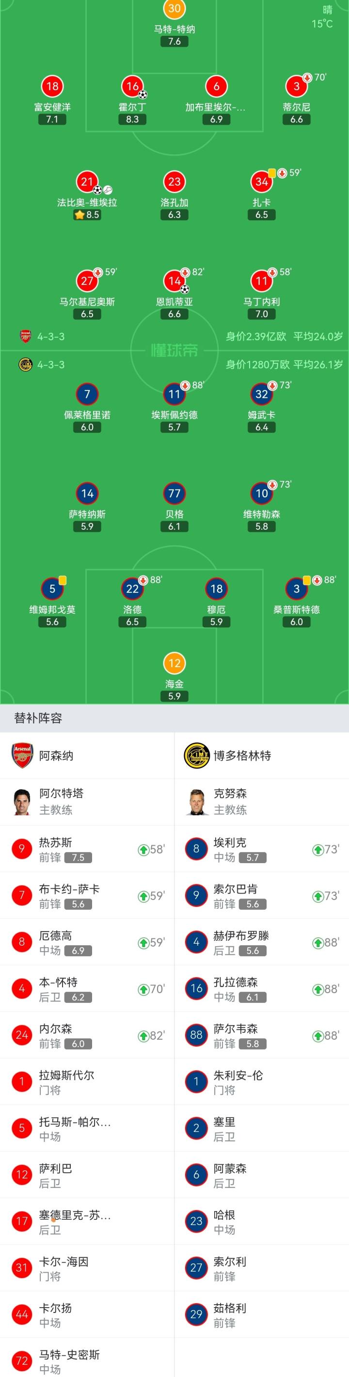 阿森纳这边下半场特塔分别试验了恩凯和热苏斯的共存(热苏斯踢左边),维埃拉和厄德高共存(厄德高踢中前卫),富安和本怀特共存(富安踢左边),既试验了前中后场主力受伤背景下其他球员客串的效果,又把球队所有位置全部轮换了一遍,伤愈复出的内尔森也捞到了出场时间
