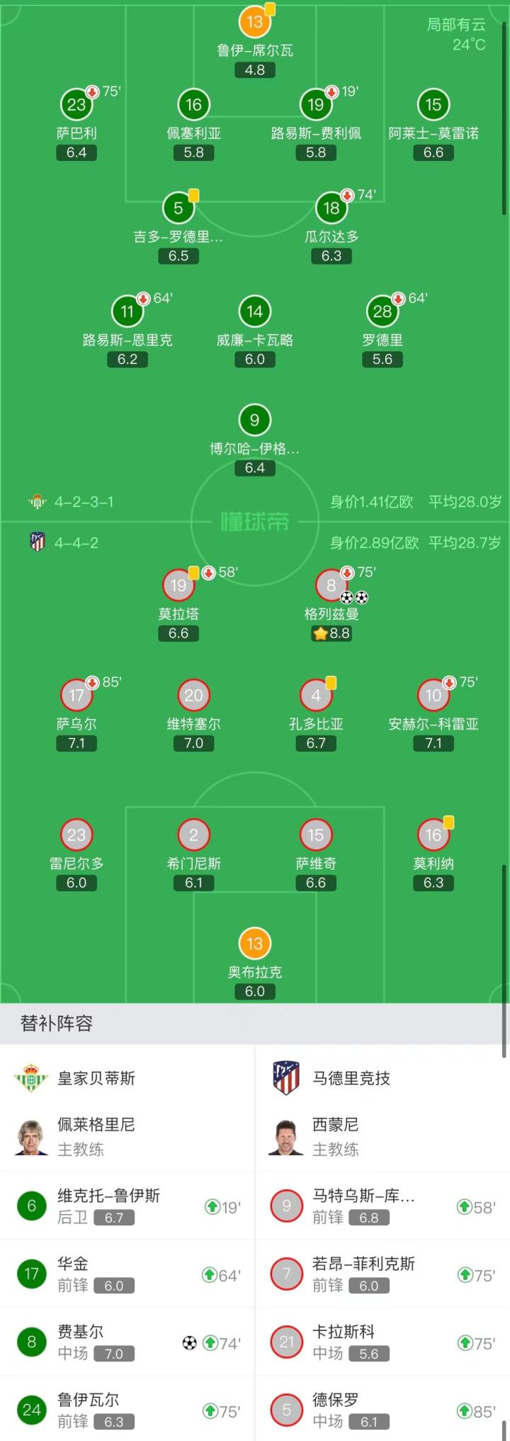 西蒙尼聪明,领先1个摆大巴着实不好解释,观众都不傻,2:0了摆大巴可以说过去,让小菲替补上了。然后小菲上去也没用,有个机会被门将抢先,还有一个机会小角度被扑出,还有一个直塞卡拉斯科,被卡带慢了节奏,然后还玩起了马赛回旋