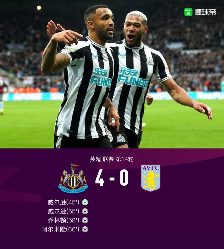 扫描下载懂球帝首页>动态> 纽卡4-0维拉取三连胜,威尔逊双响,乔林顿、阿尔米隆破门