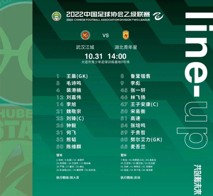 10月31日14:00,2022赛季中乙联赛第二阶段大连赛区第十二轮,凭借王子安康、麦吾兰、林飞扬三名U21球员的进球,以及U21门将努尔艾力的出色发挥,湖北青年星3-0战胜武汉江城。