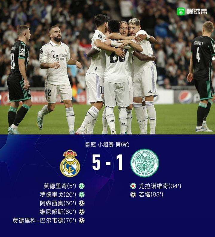 北京时间11月3日01:45,欧冠小组赛F组第6轮展开争夺,皇家马德里坐镇主场伯纳乌球场迎战凯尔特人,本场主裁判为弗拉帕尔。上半场,主裁判上演判点帽子戏法,莫德里奇和罗德里戈分别点射建功,库尔图瓦扑点;凯尔特人日本三将轮番制造威胁。下半场,阿森西奥与维尼修斯先后破门,巴尔韦德传射建功,若塔任意球世界波为凯尔特人扳回一城。最终,皇马主场多点开花5-1轻取凯尔特人,锁定小组头名。