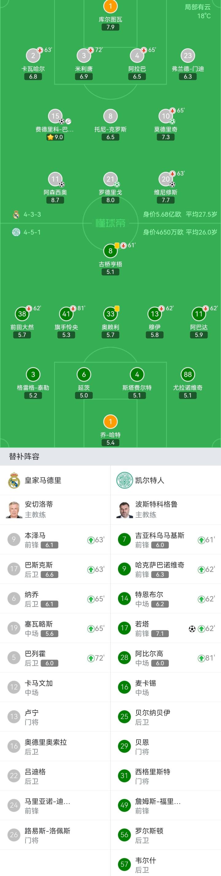 皇家马德里首发:1-库尔图瓦、23-弗兰德-门迪、4-阿拉巴(65'6-纳乔)、3-米利唐(72'5-巴列霍)、2-卡瓦哈尔(63'17-巴斯克斯)、8-托尼-克罗斯、10-莫德里奇(65'19-塞瓦略斯)、15-费德里科-巴尔韦德、11-阿森西奥、20-维尼修斯(63'9-本泽马)、21-罗德里戈