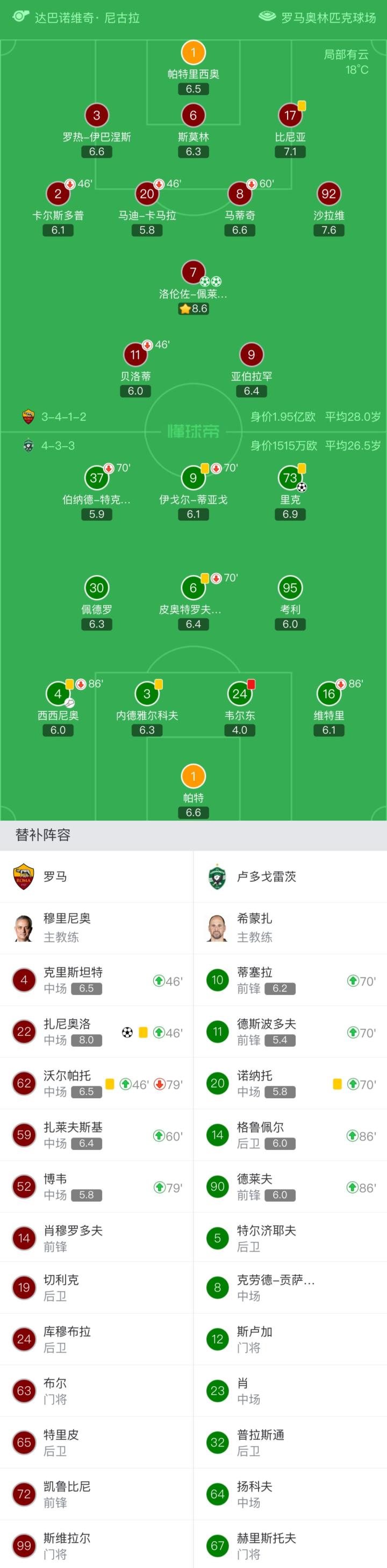 罗马首发:1-帕特里西奥、2-卡尔斯多普(46'62-沃尔帕托)(79'52-博韦)、6-斯莫林、3-伊巴涅斯、17-比尼亚、7-佩莱格里尼、8-马蒂奇(60'59-扎莱夫斯基)、20-卡马拉(46'4-克里斯坦特)、92-沙拉维、11-贝洛蒂(46'22-扎尼奥洛)、9-亚伯拉罕