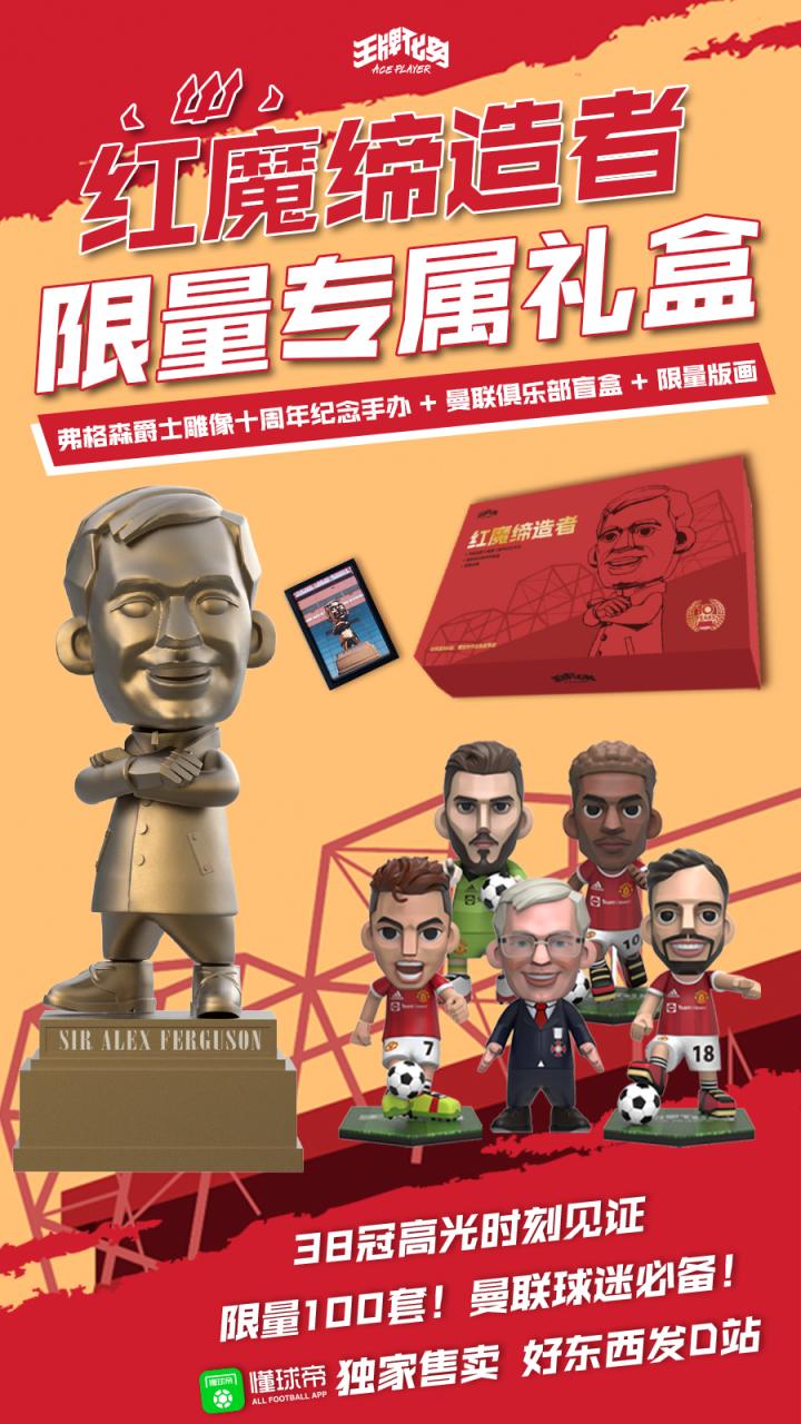 为纪念弗格森爵士雕像树立十周年,正版运动潮玩品牌王牌化身获官方授权,联合懂球帝商城共同推出「红魔缔造者」弗格森爵士雕像十周年纪念礼盒!