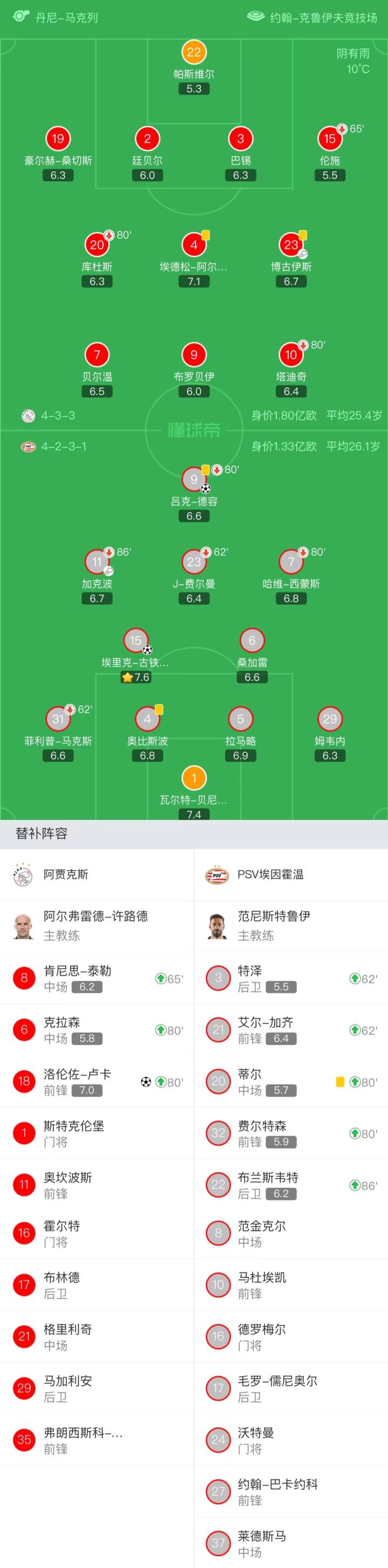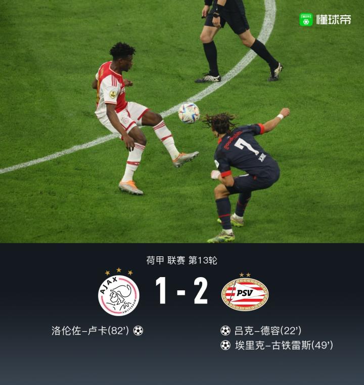 北京时间11月6日23:45,荷甲第13轮,阿贾克斯在主场约翰-克鲁伊夫竞技场对阵埃因霍温,本场比赛主裁判是丹尼-马克列。上半场,吕克-德容铲射打破僵局。下半场,埃里克-古铁雷斯推射建功,洛伦佐-卢卡抽射扳回一分,埃德松-阿尔瓦雷斯头球攻门被门将没收,最终,阿贾克斯1-2埃因霍温。