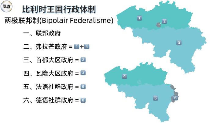 比利时在上世纪后半叶进行了大规模的行政体制改革,形成了独特的两极联邦制(Bipolair federalisme),不仅根据语言划分出弗拉芒语社群(Vlaamse Gemeenschap)、法语社群和德语社群,其主管教育、文化等个人事务;而且还平行设立了主管经济与环境等社会事务的大区(Region),即弗拉芒大区、瓦隆大区和布鲁塞尔首都大区。