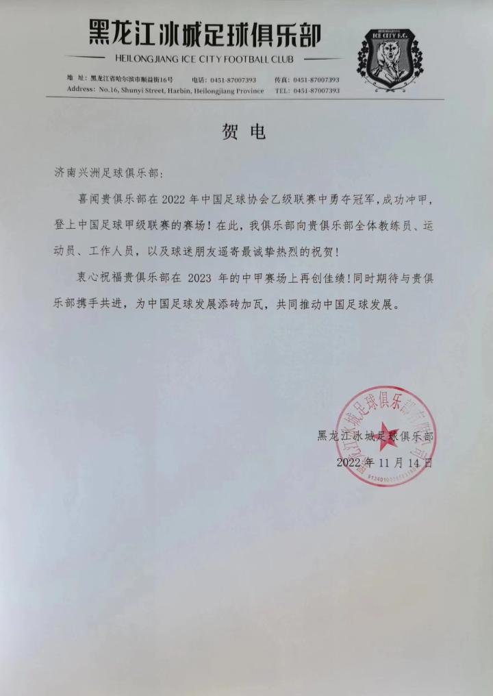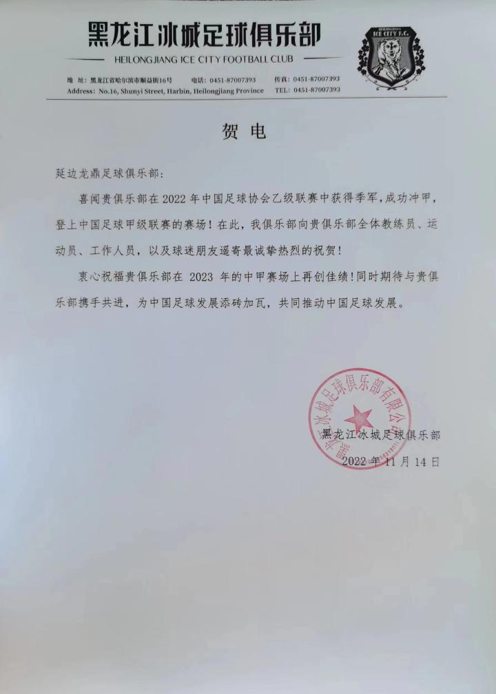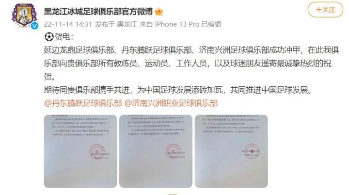 今日,黑龙江冰城足球俱乐部在社交媒体发文向济南兴洲、延边龙鼎、丹东腾跃致贺电,祝贺他们成功冲甲。
