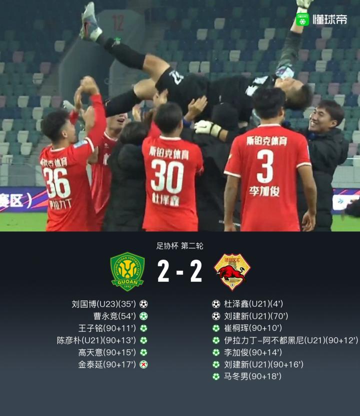 北京时间11月17日15:30,足协杯第二轮,北京国安与泾川文汇的比赛在日照国际足球中心体育场进行。上半场,杜泽鑫任意球闪击,阮奇龙助攻刘国博破门扳平比分。下半场,崔桐珲窝心脚踢中阮奇龙吃到黄点套餐,曹永竞操刀命中助国安反超;随后刘建新推射扳平将比赛拖入点球大战。点球大战中,金泰延罚失,马冬男罚入制胜点球。最终,国安爆冷点球大战3-5,总比分5-7不敌中冠球队泾川文汇遭淘汰。