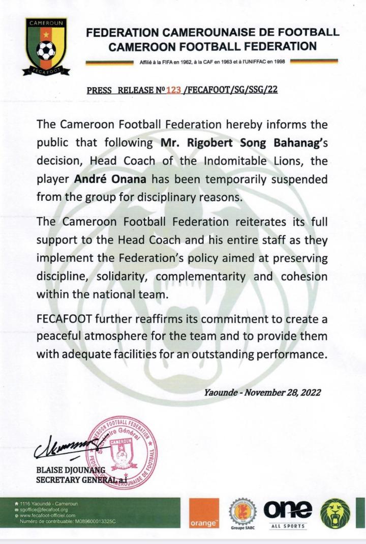 闻所未闻,一个国家队主力门将会因为纪律问题被禁赛,原因是有些人口中的因为他触球多,教练要求他少带球,居然有人真以为奥纳纳是不服从球队的安排才被禁赛,真的笑死人。喀麦隆足协完全可以对外宣称奥纳纳因个人原因缺赛塞尔维亚,为什么会发文说他是因为纪律问题?说白了,这个官方声明就是给喀麦隆队内其他人看的。国家队的人选,难道不是足协和教练选定的?既然你觉得奥纳纳纪律有问题,早些时候征召他干嘛?征召了以后,他才出现纪律问题的?国家队不训练的吗?教练不传达团队思想吗?你该怎么做,战术怎么安排,等于是事先没有告知球员的?张口闭口就是服从安排,还谈道德制高点,重点不在这儿啊,这是世界杯啊,你代表的是国家,喀麦隆足协居然官方声明一个球员因纪律问题被禁赛,太离谱了,真的“体面”。奥纳纳是真牛,喀麦隆让他暂时禁赛,他选择离开