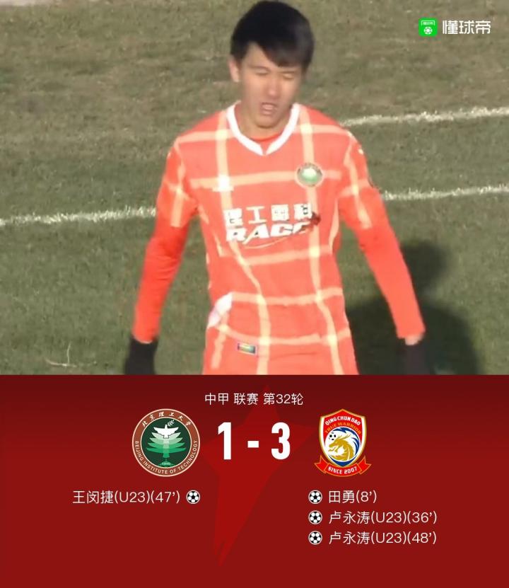 北京时间11月29日14:00,中甲第32轮,北京理工对阵青岛青春岛。上半场比赛,田勇先拔头筹,卢永涛再下一城;下半场,王闵捷扳回一球,但一分钟后卢永涛快速反击完成梅开二度。最终,青春岛3-1战胜北理工。