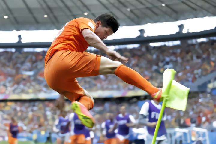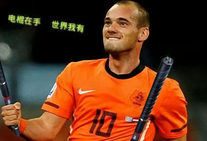 这张照片迅速传播后,不少国内的网友进行了PS,把亨特拉尔所踢到的角球杆前,换成了手拿棍子的罗本,还有面前一脸沉默的范佩西。