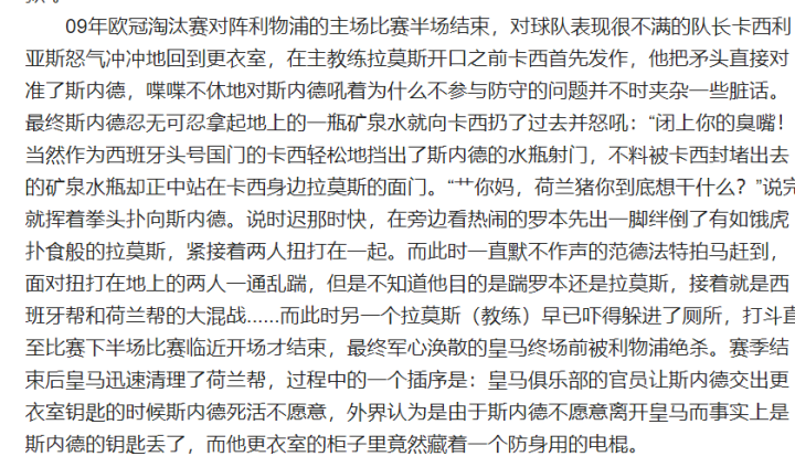 文章主要脉络清晰,对使用电棍的斯内德、铁棍的罗本、木棍的范佩西,挨棍的亨特拉尔的描述,可谓入木三分。前传讲的是斯内德在皇马更衣室与卡西利亚斯和拉莫斯斗殴,引发荷兰帮和西班牙帮数次火并。