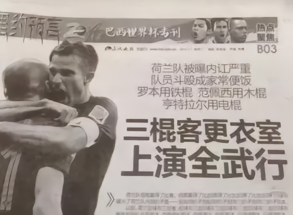 荷兰与墨西哥的比赛是在6月30日结束,按纸媒的速度和惯例,相关消息最快也只能是7月1日出版。结果到了当天,球迷没有看到对于比赛的分析,却看到了惊悚事件。一个是《辽沈晚报》整版的《三棍客更衣室上演全武行》,另一个则是《半岛晨报》的《荷兰往事:“三棍客”大闹更衣室》。