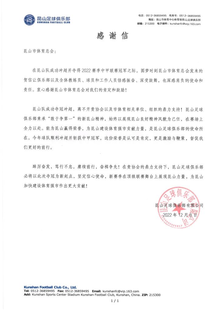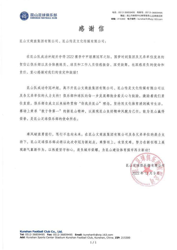 在昆山队成功冲超并夺得2022赛季中甲联赛冠军之际,圆梦时刻昆山市体育总会、昆山文商旅集团及兄弟单位发来的贺信让俱乐部以及全体教练员、球员和工作人员倍感振奋、深受鼓舞,也深感肩负的使命和责任。衷心感谢对我们的肯定和鼓励!