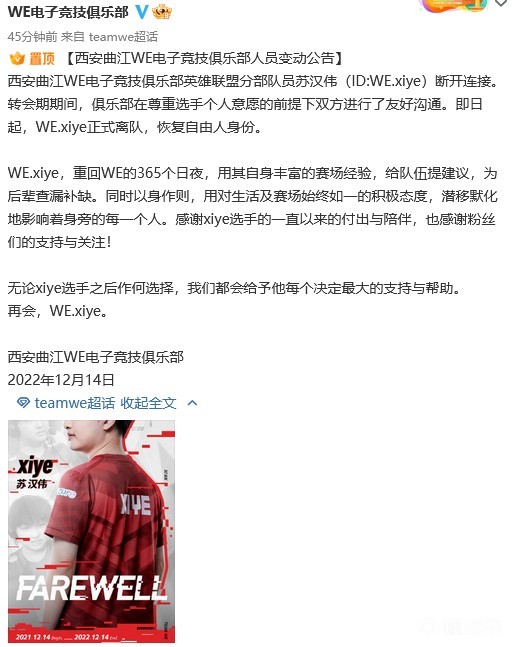 扫描下载懂球帝首页>动态> WE官宣:xiye正式离队,恢复自由人身份