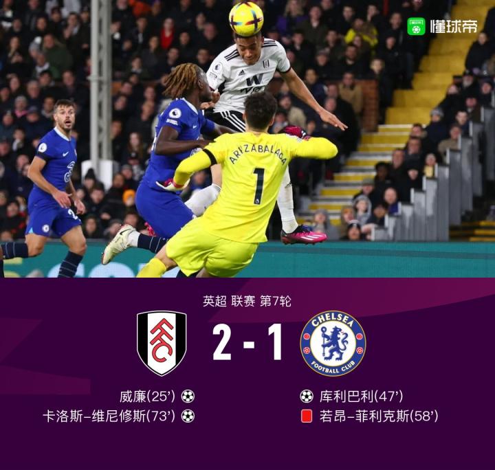 北京时间1月13日4:00,英超第7轮,切尔西客场挑战富勒姆。上半场,哈弗茨打门被封堵,卡洛斯-维尼修斯抽射打偏,德科多瓦-里德中框,威廉打破僵局,刘易斯-霍尔抽射被扑,菲利克斯抽射被莱诺扑出。下半场,库利巴利补射破门,菲利克斯飞铲染红,成为切尔西队史首位在英超首秀直接吃到红牌的球员,卡洛斯-维尼修斯头球破门,最终,切尔西1-2富勒姆,联赛遭遇3轮不胜。