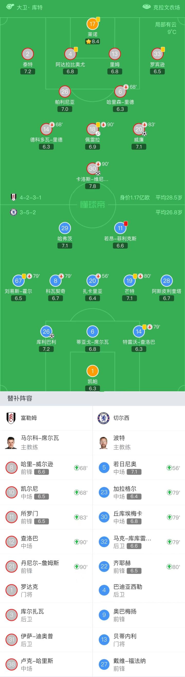 富勒姆首发:17-莱诺、2-泰特、4-阿达拉比奥尤、13-里姆、33-罗宾逊、26-帕利尼亚、6-哈里森-里德(68'10-凯尔尼)、14-德科多瓦-里德(68'8-哈里-威尔逊)、18-佩雷拉(93'21-丹尼尔-詹姆斯)、20-威廉(83'11-所罗门)、30-卡洛斯-维尼修斯(94'12-查洛巴)