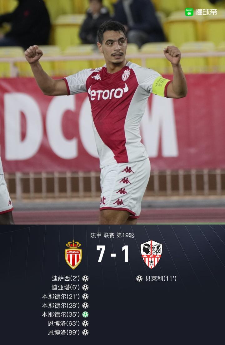 第35分钟,本耶德尔点射上演帽子戏法,摩纳哥5-1阿雅克肖!