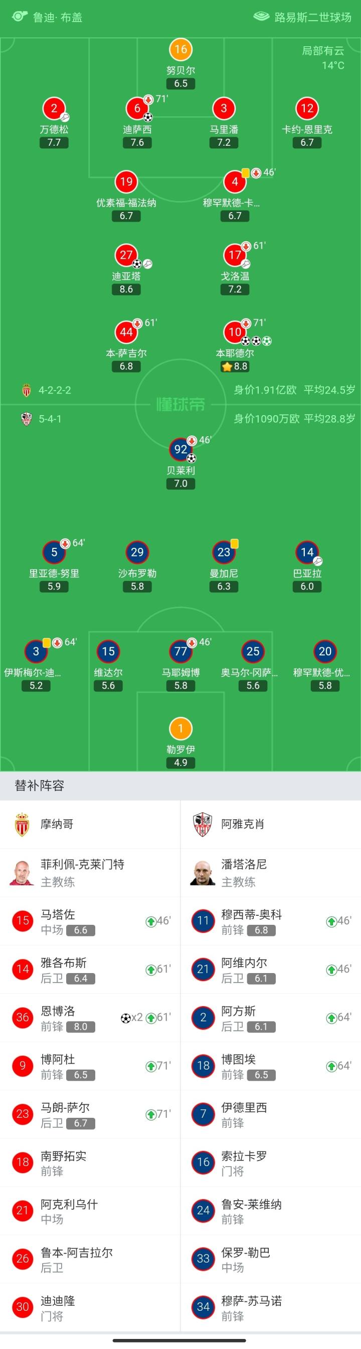 摩纳哥首发:16-努贝尔、12-卡约-恩里克、3-马里潘、6-迪萨西、2-万德松、17-戈洛温、4-穆罕默德-卡马拉、19-优素福-福法纳、27-迪亚塔、44-本-萨吉尔、10-本耶德尔