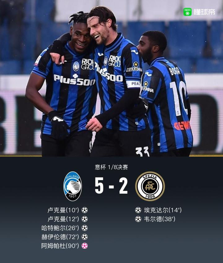 扫描下载懂球帝首页>动态> 亚特兰大5-2斯佩齐亚晋级,卢克曼2分钟2球,萨帕塔两助攻
