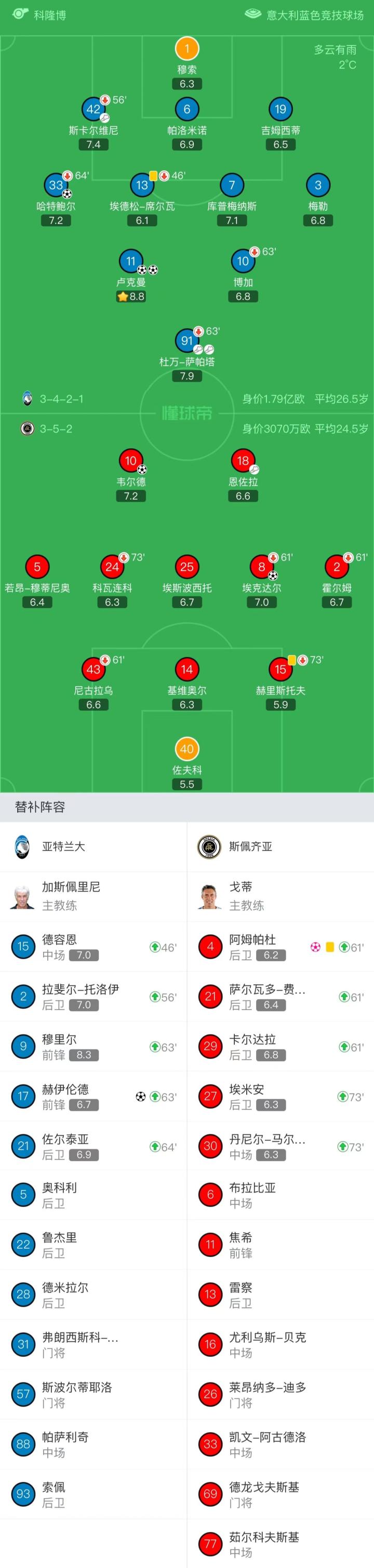 赫伊伦徳的射术,萨帕塔和卢克曼之间的化学反应,以及亚特兰大全体进攻看的真是赏心悦目。斯佩齐亚上半场也还可以,韦尔德真不愧是杯赛先生,全队最拼