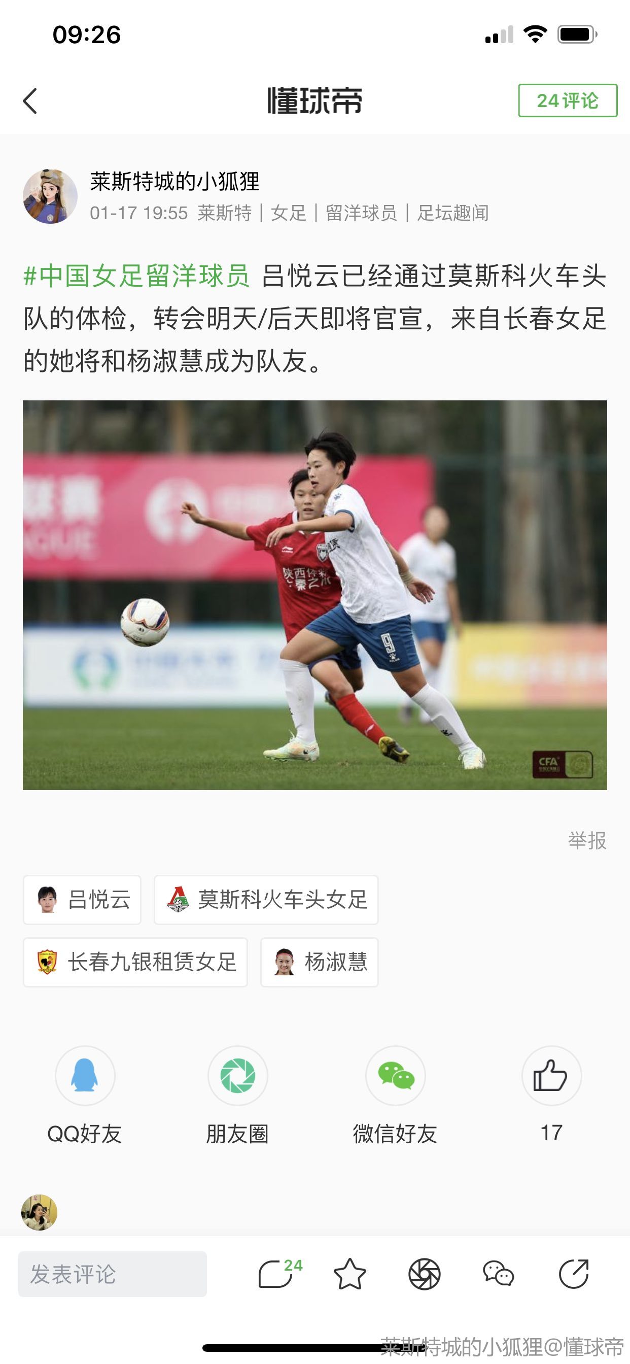 俄罗斯莫斯科火车头女足官方宣布,签约中国女足球员吕悦云。她将身披9号球衣。