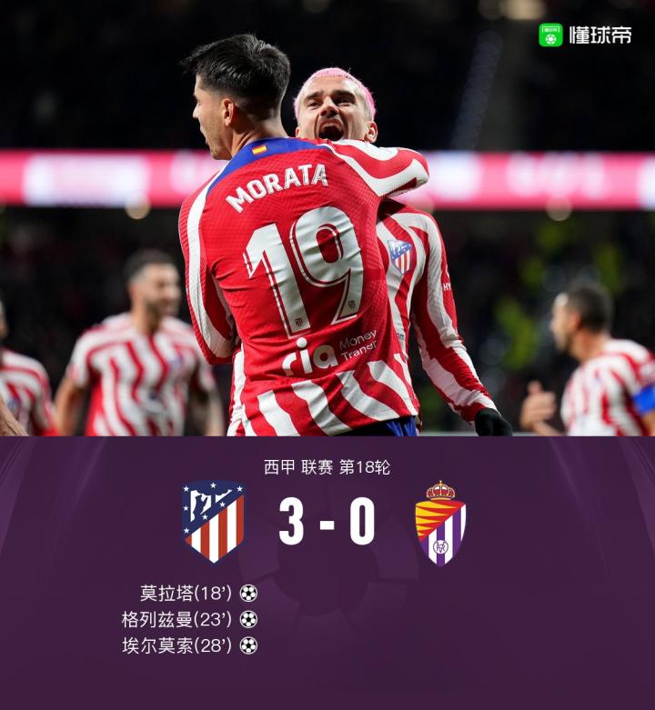 扫描下载懂球帝首页>动态> 马竞3-0巴拉多利德,格列兹曼传射,莫拉塔、埃尔莫索破门