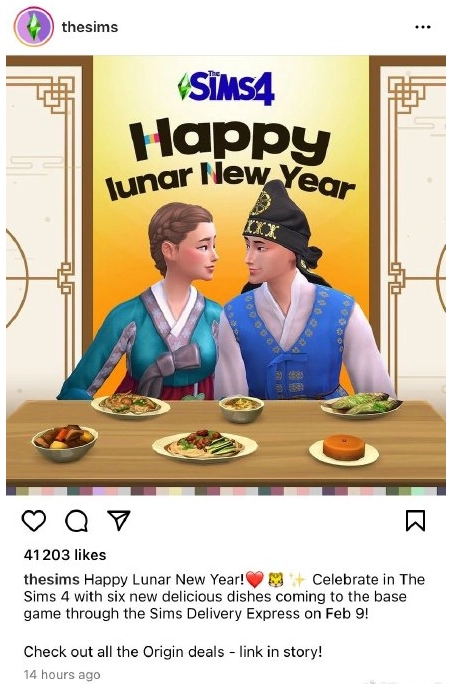 一年前的2月1日,同样是在春节前夕,EA旗下的《模拟人生》(the sims)在官方Instagram上发文送上新春祝福。