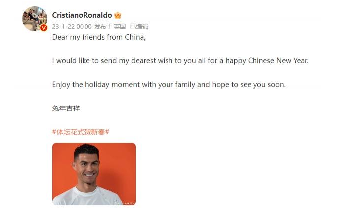 无独有偶,日前C罗也在社交媒体上祝福中国球迷新年快乐,其用词是“中国新年(Chinese New Year)”,本来没有任何问题,却依然被韩国媒体和叫兽揪住不放。