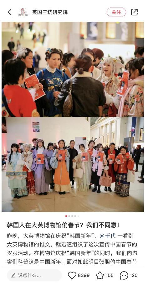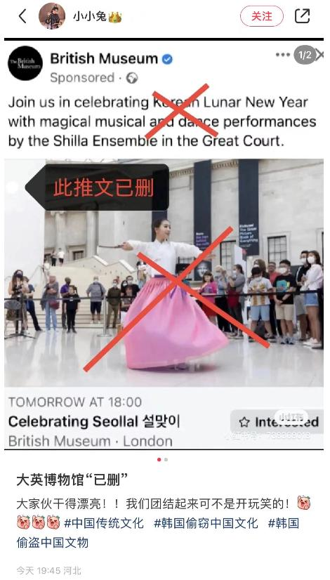 号称全球专业的历史博物馆——大英博物馆,除夕前就在官网和推特上发布了一则题为“庆祝韩国新年”的文章,配图是一名韩国女子穿着民族传统服饰跳舞的图片。