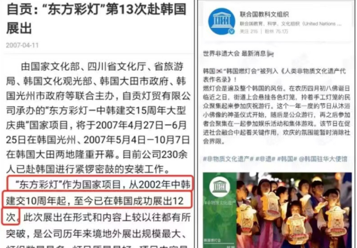 类似的事,当然不是第一次,也不可能是最后一次。最扯的一件事和彩灯有关,自贡著名的“东方彩灯”2002年来到韩国展览后,迅速走红。到了2020年,韩国将他们改良包装后以“佛教燃灯会”的名义入选非遗。而在自贡彩灯来到韩国之前,这里没有任何类似的彩灯活动。