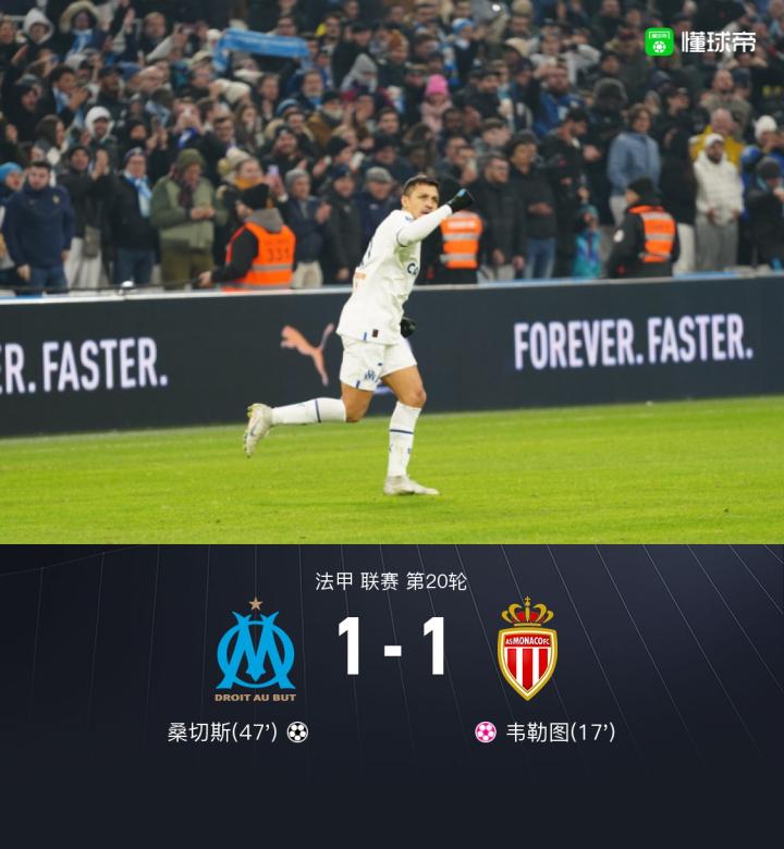 扫描下载懂球帝首页>动态> 马赛1-1摩纳哥结束联赛6连胜,韦勒图乌龙球,桑切斯补射建功