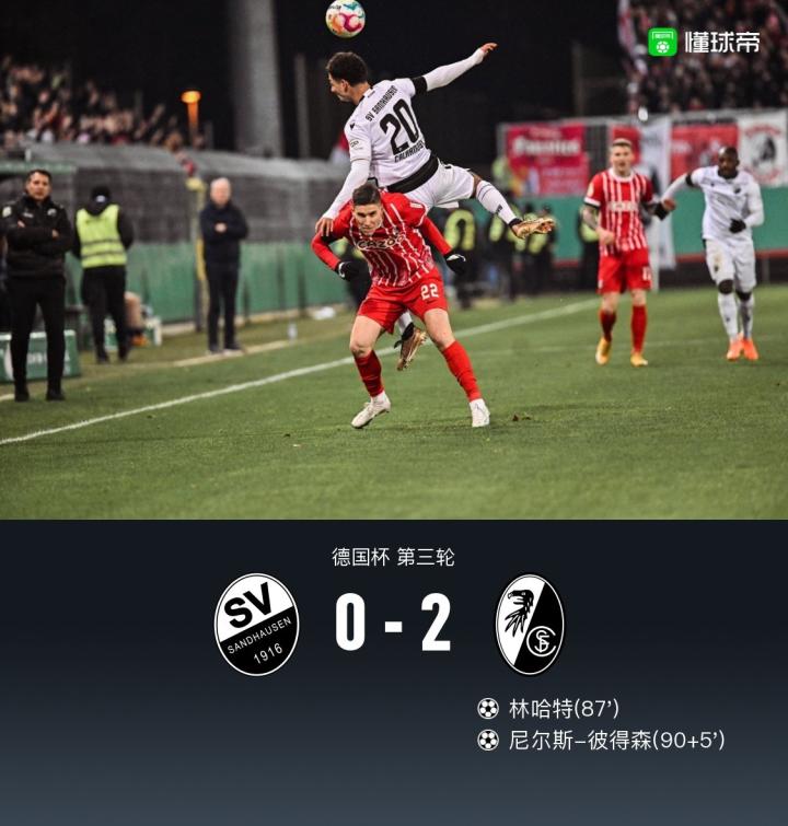 北京时间2月8日01:00,德国杯1/8决赛继续进行,弗赖堡作客哈特森林BWT球场挑战德乙球队桑德豪森,本场主裁判为马尔科-弗里茨。上半场,库布勒头球攻门造险。下半场,林哈特破僵,尼尔斯-彼得森读秒抓住对方门将低级失误破门锁定胜局。最终,弗赖堡客场2-0击败桑德豪森,晋级德国杯八强。