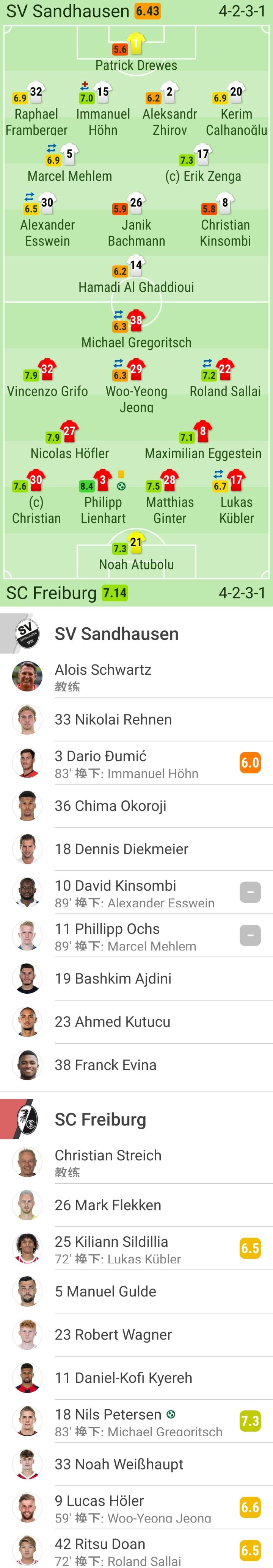 弗赖堡首发:21-阿图博卢、3-林哈特、28-金特尔、17-库布勒(72'25-西尔迪利亚)、30-京特尔、27-霍夫勒、8-马克西米利安-埃格施泰因、29-郑优营(59'9-霍勒)、32-格里福、22-罗兰-绍洛伊(72'42-堂安律)、38-格雷戈里奇(83'18-尼尔斯-彼得森)
