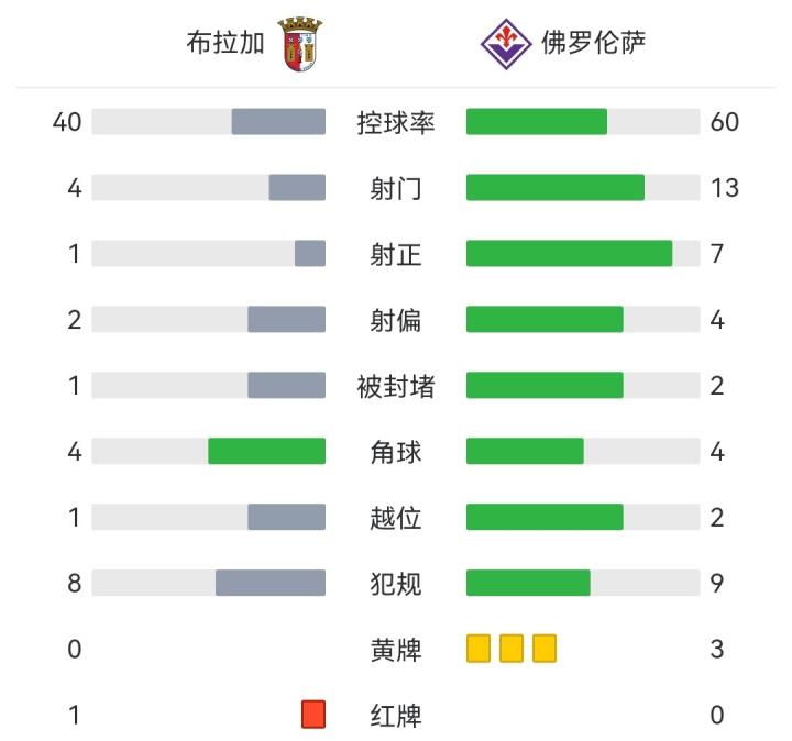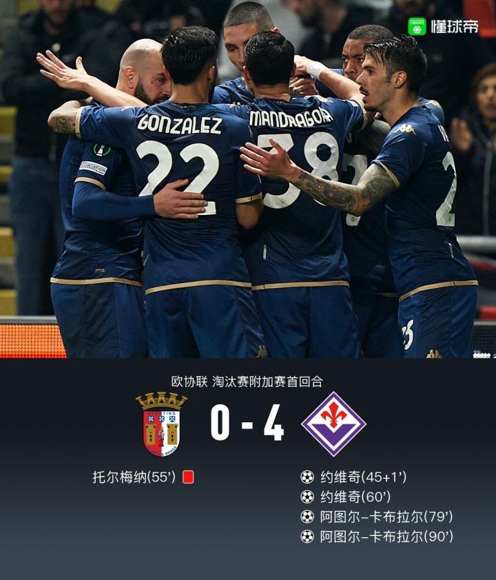 北京时间2月17日01:45,欧协联淘汰赛附加赛首回合,布拉加坐镇主场布拉加市政球场迎战佛罗伦萨,本场主裁判为德尔塞罗。上半场,约维奇甩头破门,阿韦尔-鲁伊斯失良机。下半场,托尔梅纳被直红罚下,约维奇再下一城上演梅开二度,阿图尔-卡布拉尔替补连下两城也完成双响,比拉吉本场两送助攻。最终,十人布拉加主场0-4惨败佛罗伦萨。