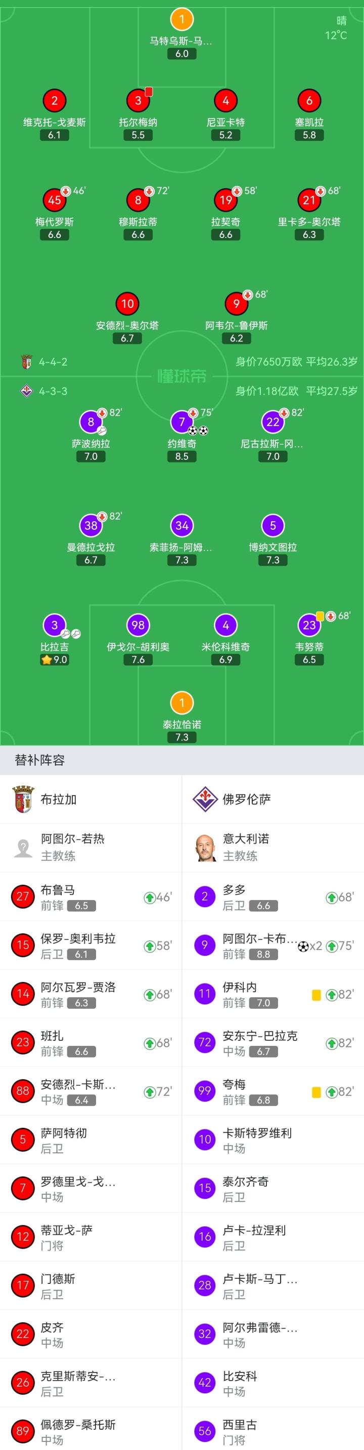 布拉加首发:1-马特乌斯-马加良斯、2-维克托-戈麦斯、4-尼亚卡特、3-托尔梅纳、6-塞凯拉、10-安德烈-奥尔塔、19-拉契奇(58'15-保罗-奥利韦拉)、8-穆斯拉蒂(72'88-安德烈-卡斯特罗)、45-梅代罗斯(46'27-布鲁马)、21-里卡多-奥尔塔(68'14-阿尔瓦罗-贾洛)、9-阿韦尔-鲁伊斯(68'23-班扎)