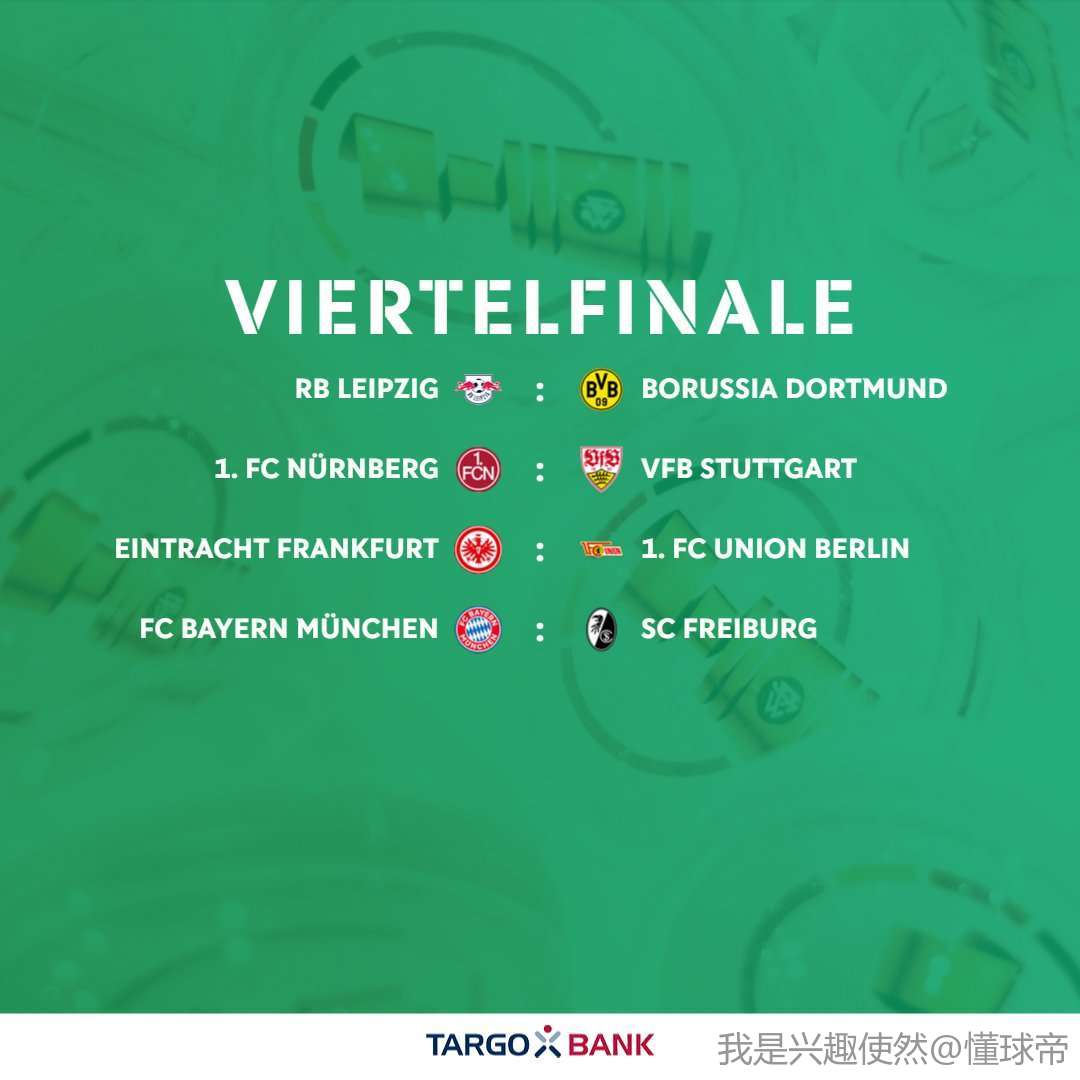 懂球帝首页>动态> 德国杯八强抽签:莱比锡vs多特蒙德,拜仁vs弗赖堡