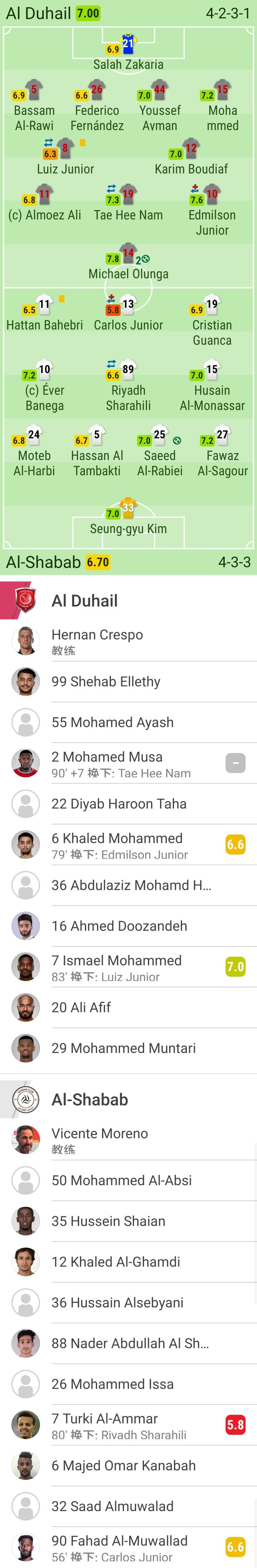 杜海勒首发:21-萨拉赫-哈桑、5-巴萨姆-拉维、26-费德里科-费尔南德斯、44-优素福-艾曼-法拉哈特、15-哈立德-穆罕默德、8-路易斯-塞阿拉(83'7-伊斯梅尔-穆罕默德)、12-卡里姆-布迪亚夫、10-埃德米尔森-儒尼奥尔(79'6-穆罕默德-哈立德)、19-南泰熙(90+7'2-穆罕默德-穆萨)、14-奥伦加、11-莫埃兹-阿里