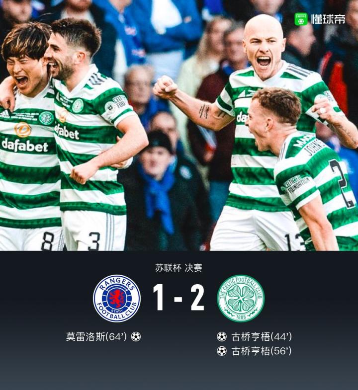 北京时间2月26日23:00,苏格兰联赛杯决赛在汉普顿公园球场展开角逐,流浪者对阵凯尔特人,本场主裁判为沃尔什。上半场,前田大然助攻古桥亨梧破门。下半场,古桥亨梧接旗手怜央的助攻再下一城上演梅开二度,莫雷洛斯为流浪者扳回一城。最终,凯尔特人2-1力克流浪者,捧得苏格兰联赛杯!