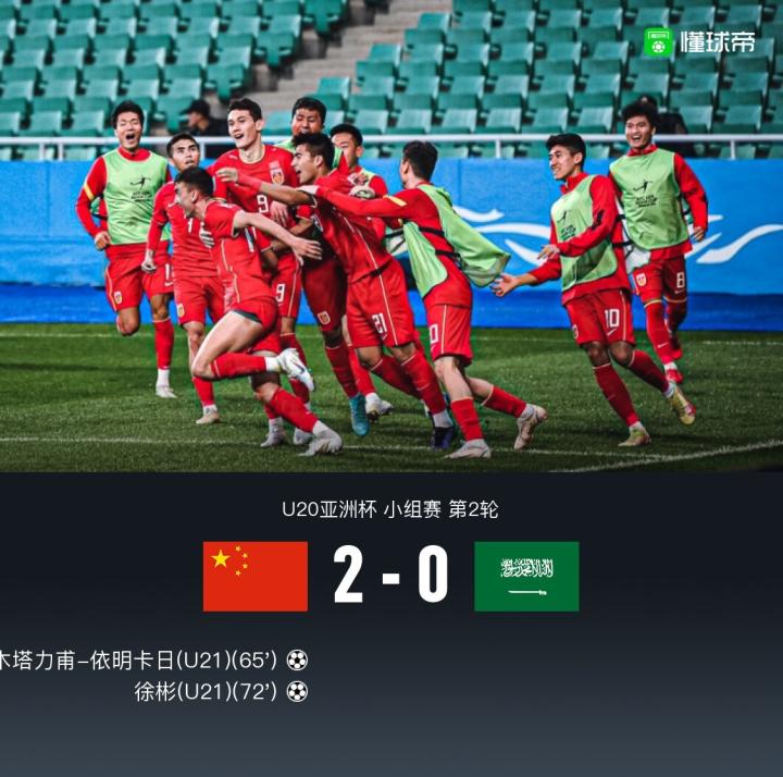 扫描下载懂球帝首页>动态> U20中国2-0沙特U20获首胜,木塔力甫替补传射建功,徐彬破门