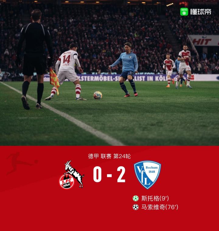 北京时间3月11日3:30,德甲第24抡,科隆主场对阵波鸿。上半场,斯希里远射被门将挡出,许伯斯送点,斯托格点射破门。下半场,浅野拓磨助攻马索维奇抽射破门,沙博特抽射被门将没收,最终,科隆0-2波鸿。