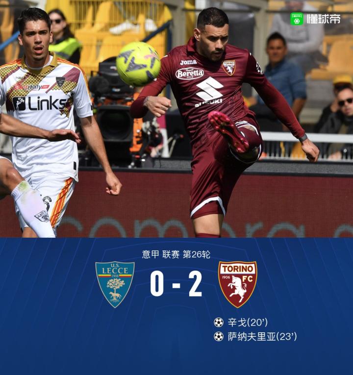 北京时间3月12日19:30,意甲第26轮比赛,莱切对阵都灵。上半场,辛戈、萨纳夫里亚3分钟内连入两球;下半场,阿多波门前制造威胁,不过被法尔科内化解,最终都灵2-0客胜莱切。