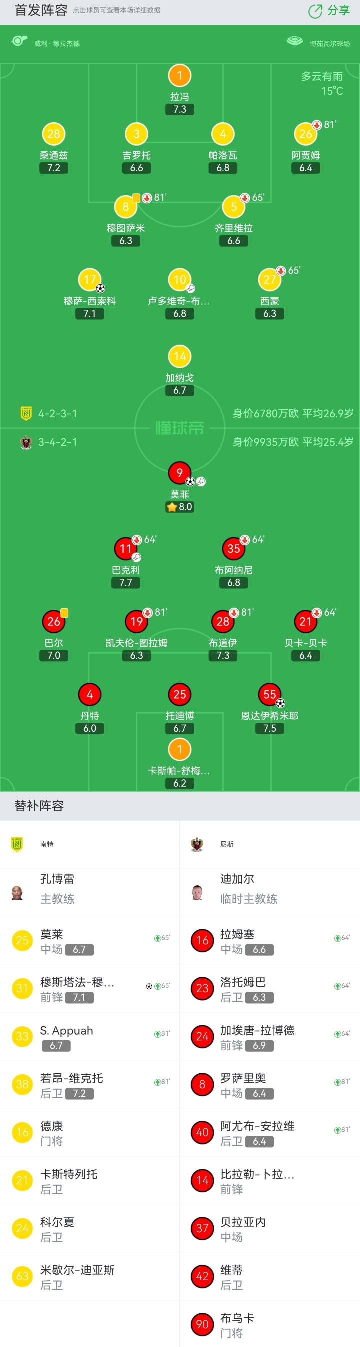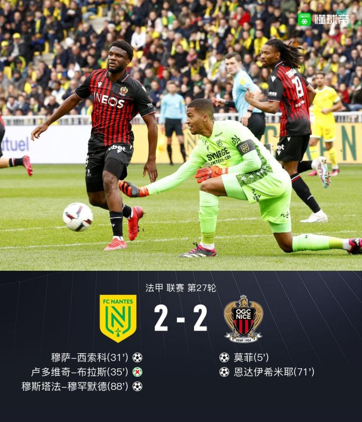北京时间3月12日22:00,法甲第27轮,南特坐镇主场迎战尼斯。上半场,第5分钟巴克利开出角球,莫菲中路包抄头球破门。第31分钟卢多维奇-布拉斯开出定位球,穆萨-西索科头球破门。第33分钟桑通兹突破至禁区被放倒,裁判判罚点球,卢多维奇-布拉斯主罚点球击中横梁弹出。下半场,第71分钟莫菲做球给恩达伊希米耶,后者迎球推射破门。第88分钟,穆斯塔法-穆罕穆德禁区中路高高跃起,头球攻门帮助球队扳平比分。最终,南特2-2尼斯。